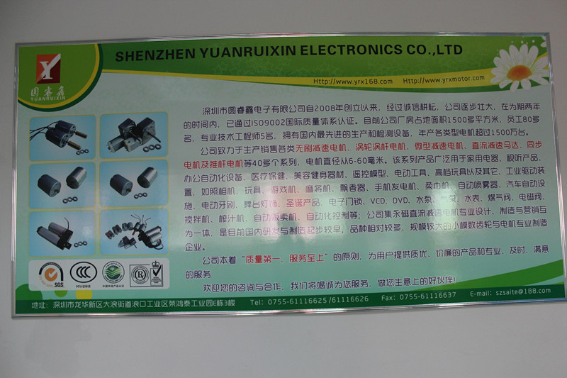 深圳市圓睿鑫電子有限公司自2008年創立以來,經過誠信耕耘,在為期兩年的時間內,已通過ISO9001:2000國際質量體系認證。公司廠房占地面積2000多平方米,員工100人,專業技術工程師6名,擁有國內最先進的生產和檢測設備,年產各類減速電機超過2~300萬臺。因公司發展需要,于2020年底,將生產基地遷往擁有最美小鎮之稱的東莞市清溪鎮,依山傍水,依托美麗的大自然環境和地方文化,全新的東莞市圓睿鑫電子有限公司將借助深圳母公司平臺,一步步走上新的臺階。